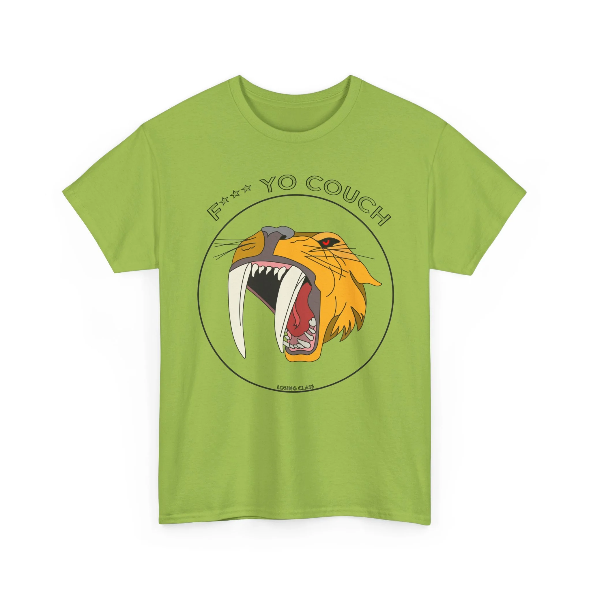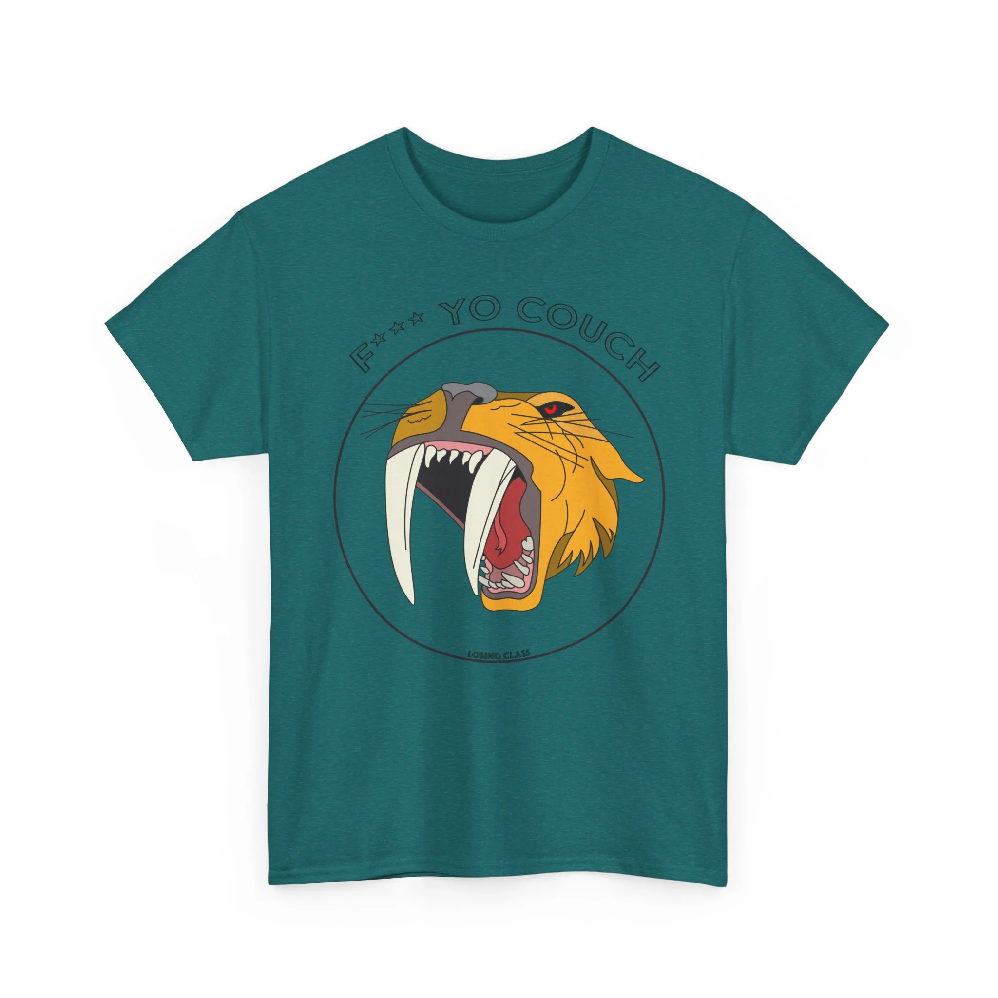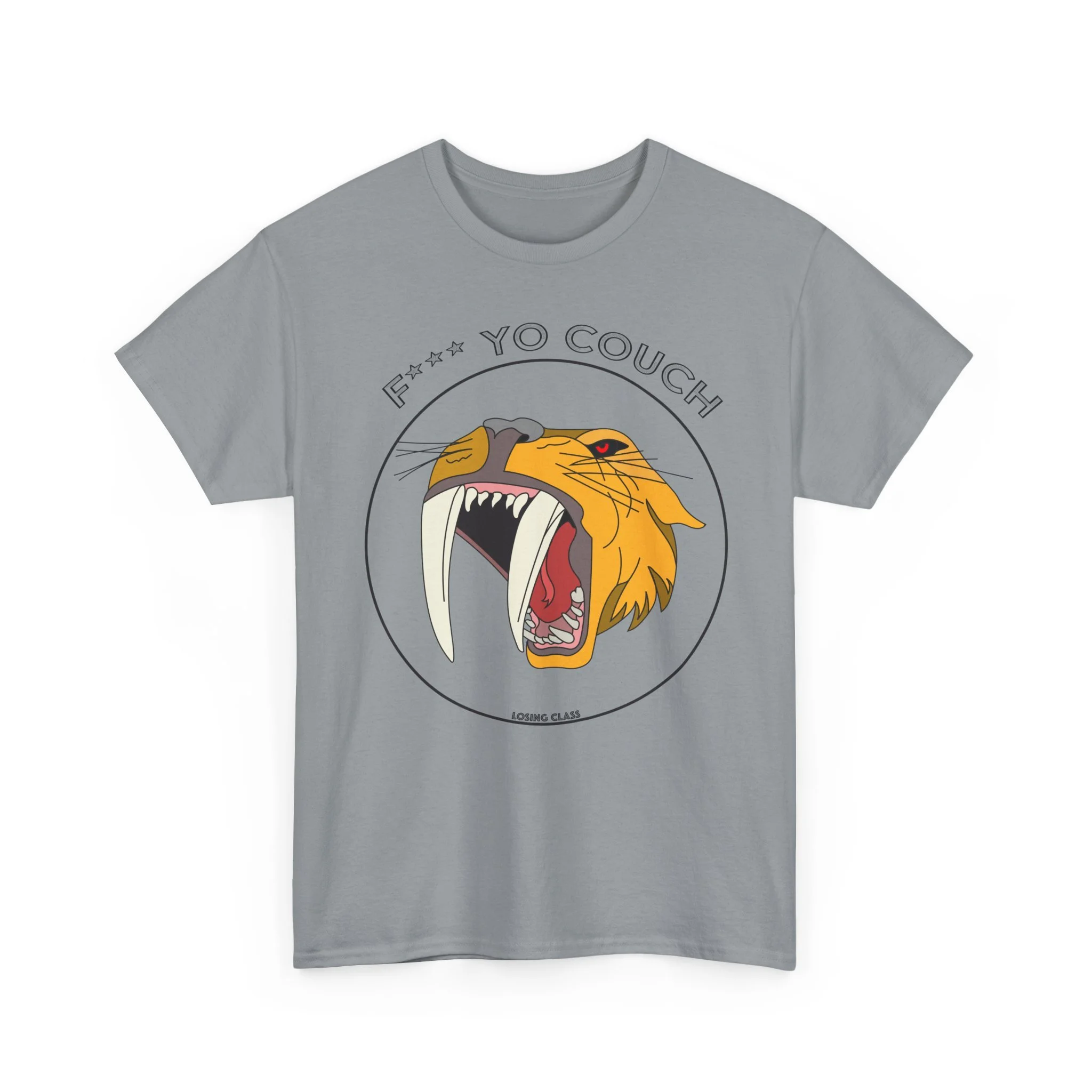 A bold, vintage-inspired tee that roars with personality. The center-front graphic features a stylized sabertooth tiger mid-roar, framed by a circular badge and cheeky lettering above — a design that nods to retro skate and punk patches while staying fresh and wearable. The medium-weight cotton body holds print detail crisply, so the teeth, whiskers, and textured mane read sharp whether you’re layering under a jacket or wearing it solo. Wear it to skateparks, late-night gigs, or lazy weekends when you want your outfit to speak with a little attitude. The fit is relaxed and comfortable, leaving room to move without looking sloppy. Durable construction and a soft ribbed collar keep the silhouette tidy wash after wash.