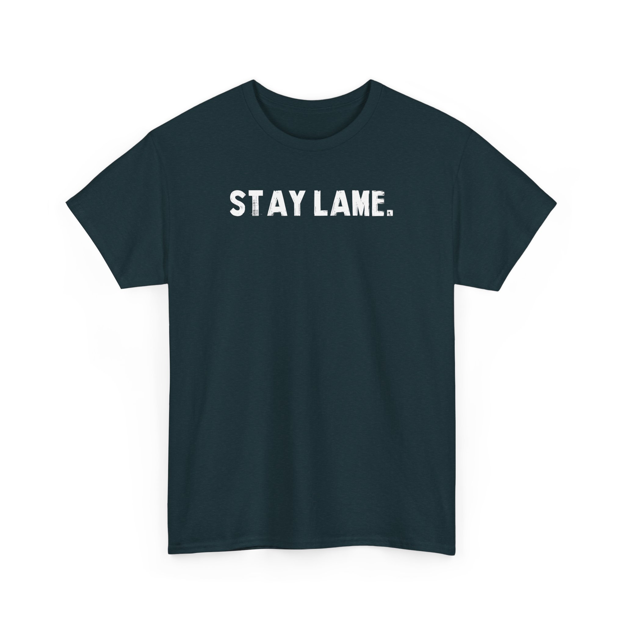 A bold, deadpan tee that speaks soft sarcasm loud and clear. The compact, all-caps “STAY LAME.” print sits across the chest in brushed white type, cutting a cool contrast against the black fabric. Wear it on low-key days when you want to rib the room without shouting. It pairs as easily with ripped jeans and a beanie as it does with a cardigan for late-night board games or coffee-run conversations. The vibe is dry, ironic, and entirely comfortable — made for people who prize wit over flash and prefer to let a single line do the talking.