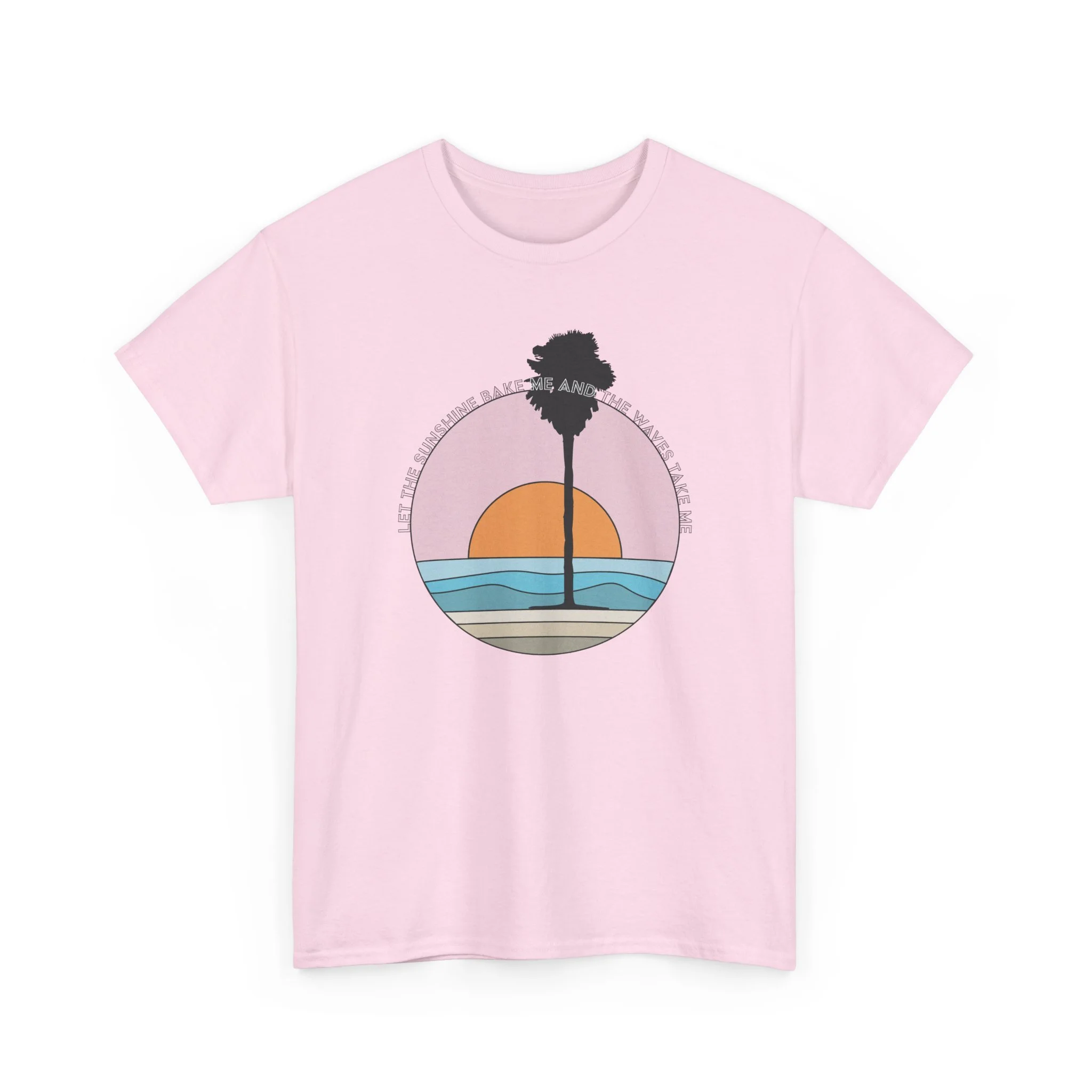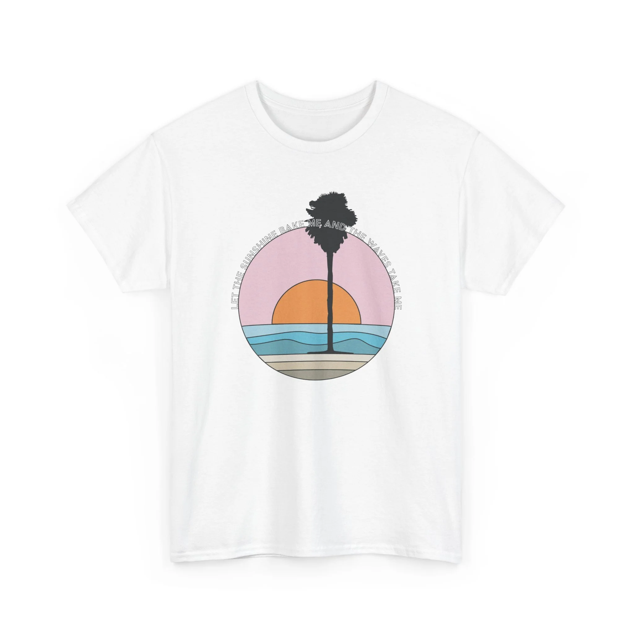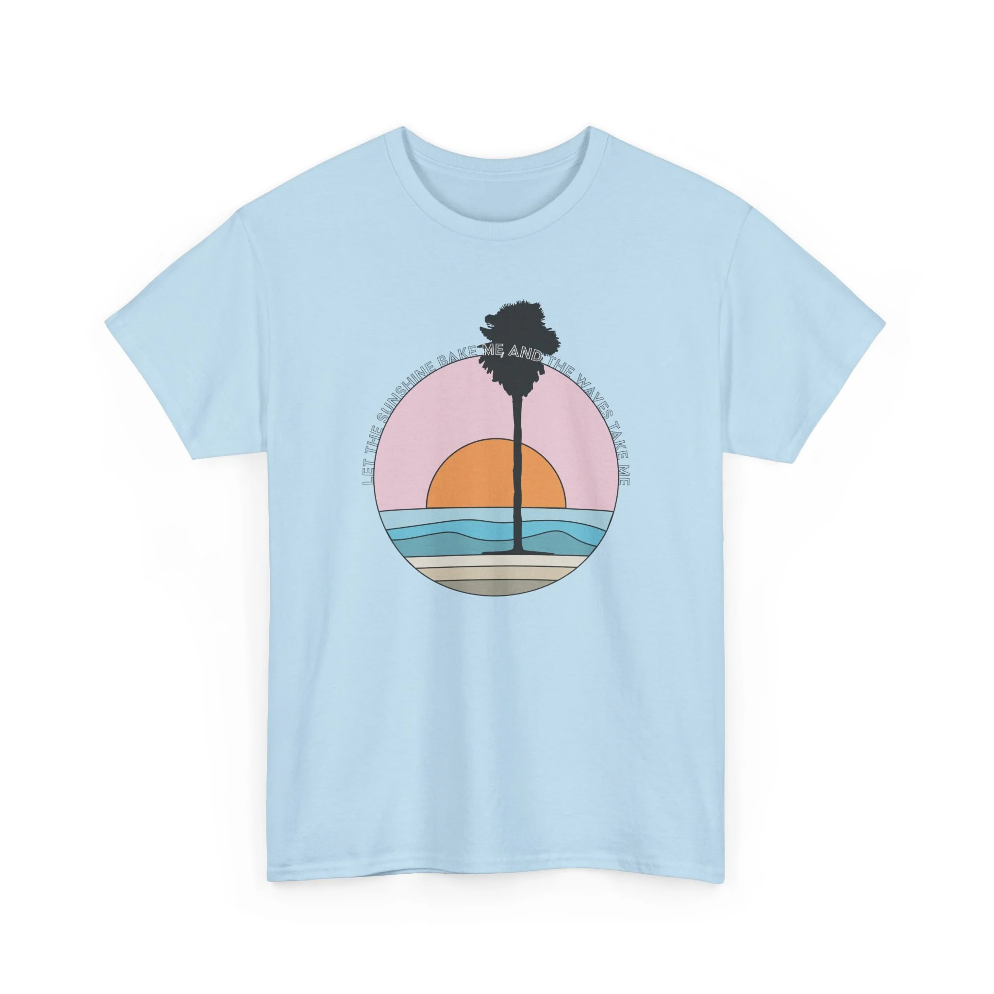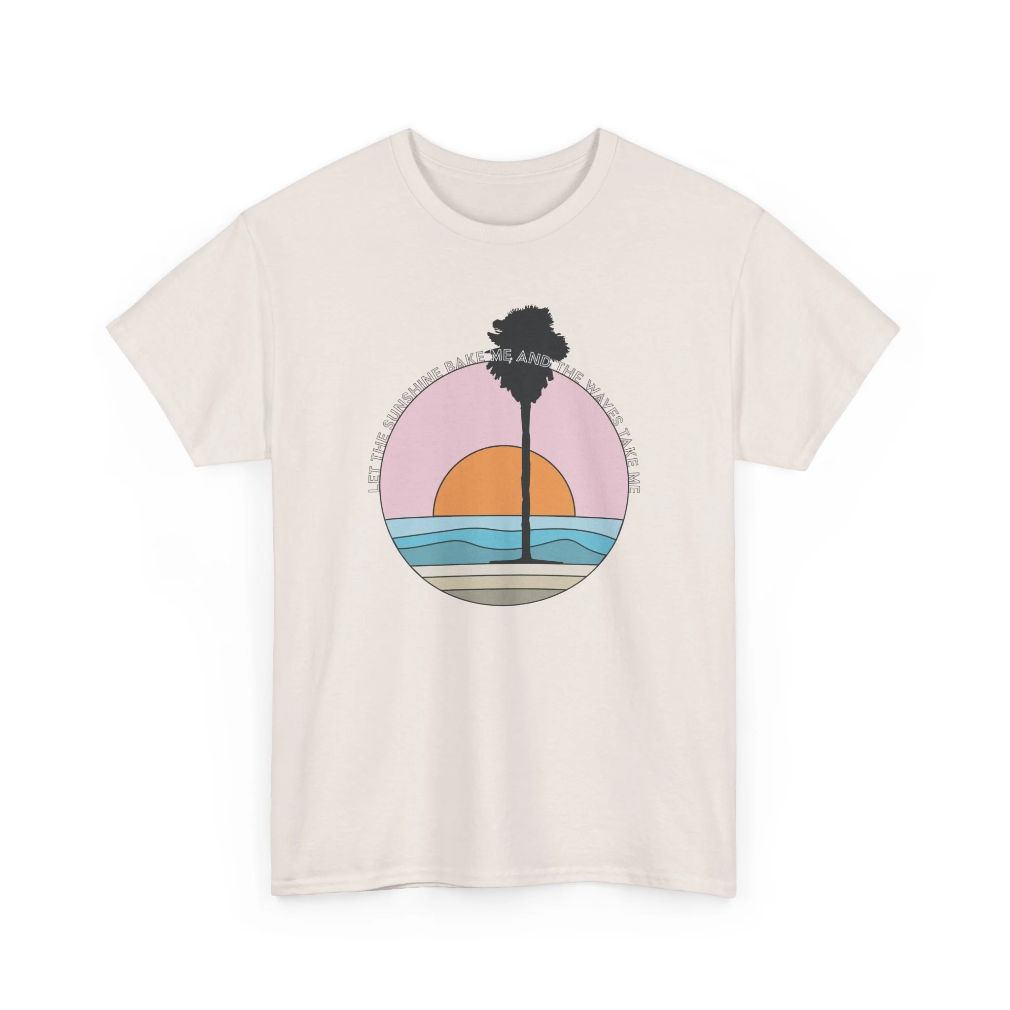Warm light spills across the horizon as the sun dips behind a lone palm—this tee carries the slow, salty hush of a coastal evening. The soft, roomy cut drapes easily over a surfboard-strapped shoulder or a sweater layered for a foggy morning walk. Subtle vintage hues in the circular sunset graphic keep the look mellow and wearable, letting the art speak without shouting. Wear it to watch waves, run errands between tides, or linger on a porch with friends; it feels lived-in from the first outing and only gets better with time.